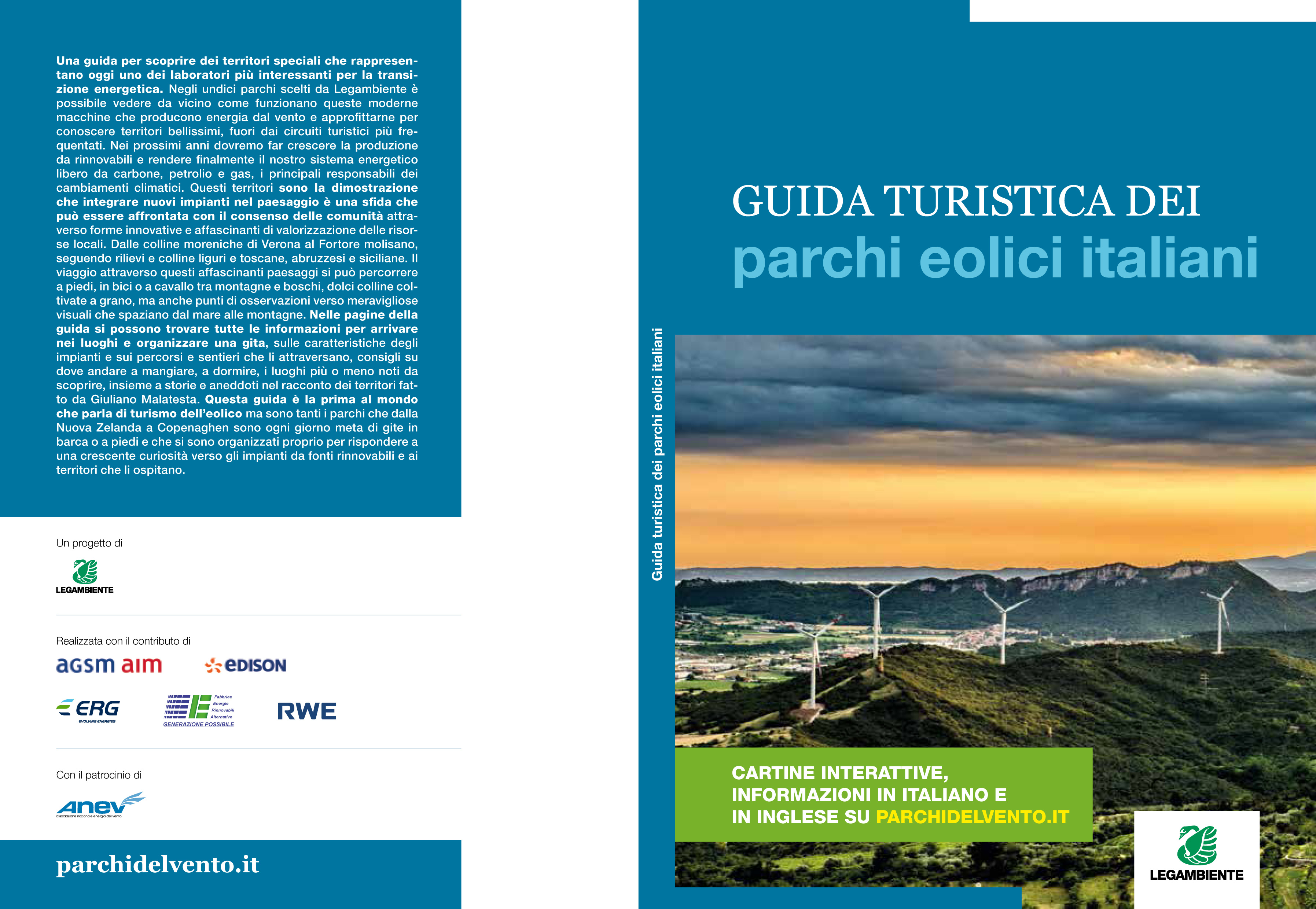 La guida si pone l’obiettivo di fare scoprire dal punto di vista turisticogli impianti eolici in Italia fornendo notizie e informazioni su particolarità naturalistiche, storiche, culturali e gastronomiche in un vero e proprio viaggio nei territori del vento lungo tutta la nostra penisola